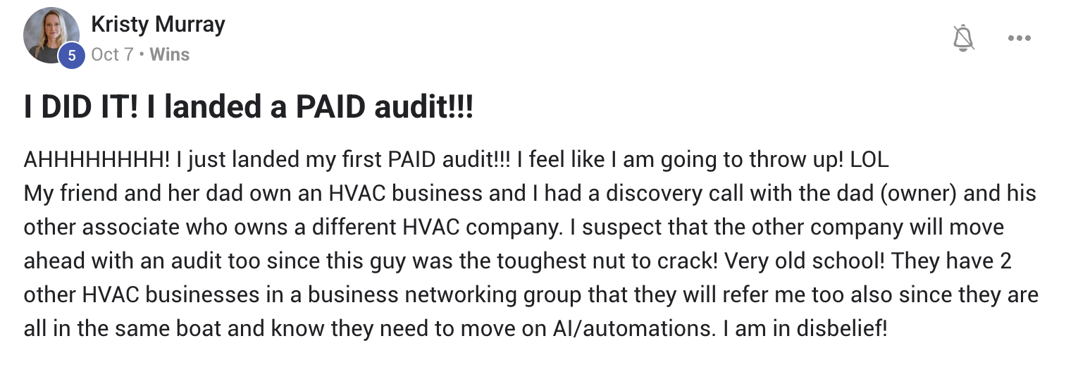 Kristy closed an HVAC company, then got introduced to 2 additional HVAC companies from that same client. Another member landed an audit with a business owner who then wanted audits for all his other companies.